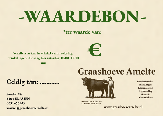 Leuk om te krijgen, maar ook erg leuk om te geven; waardebon Graashoeve Amelte. Deze is in 2 varianten te bestellen; of €25.00 of € 50.00. Vrij te besteden in de boerderijwinkel of in onze webshop.